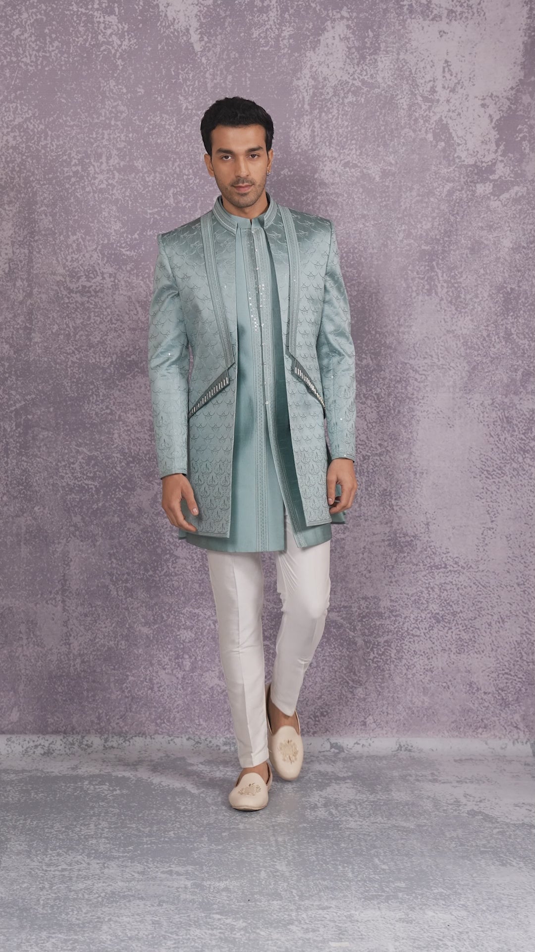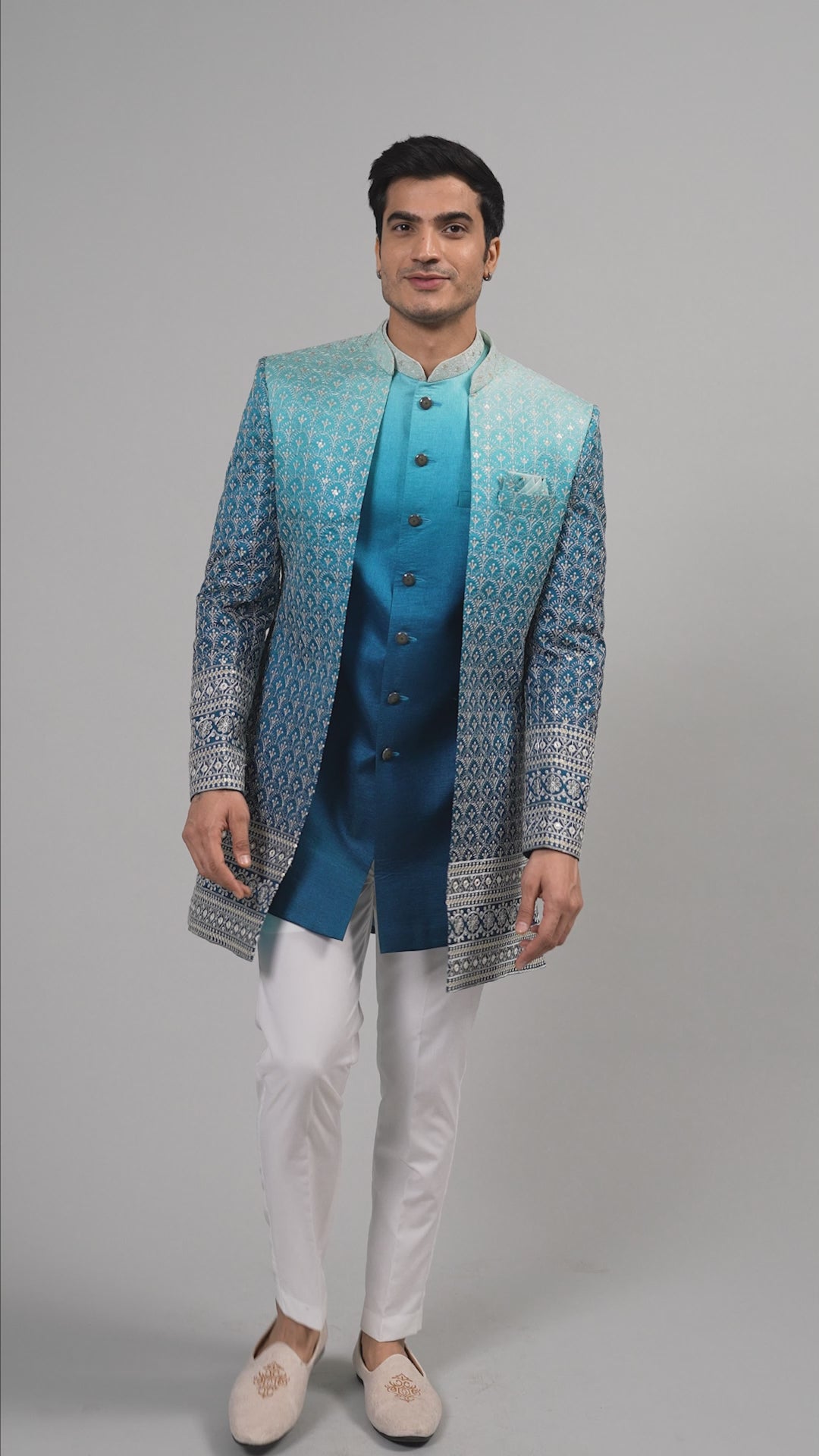 Turquoise Blue Silk Indo Western with Resham & Sequence Work