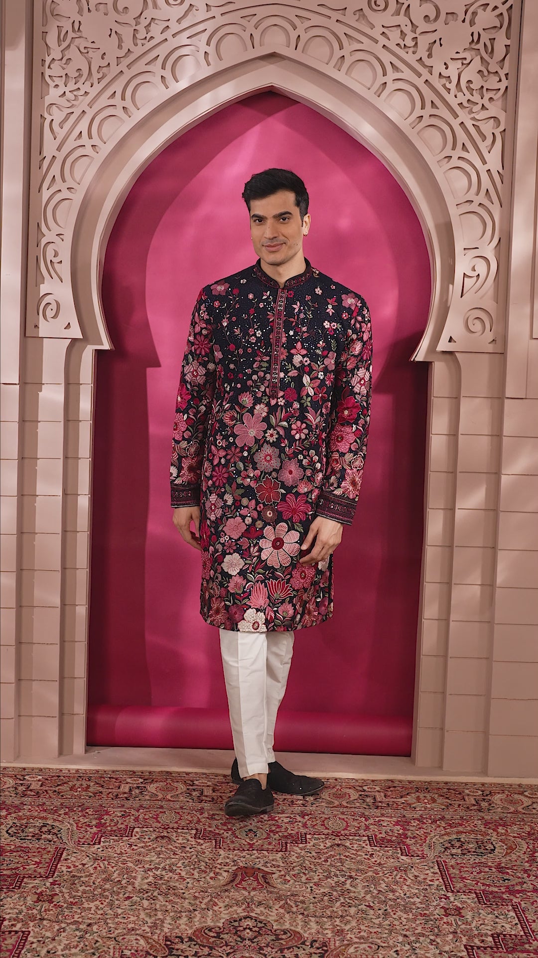 Navy Blue Silk Kurta Set with Floral Thread Embroidery Work