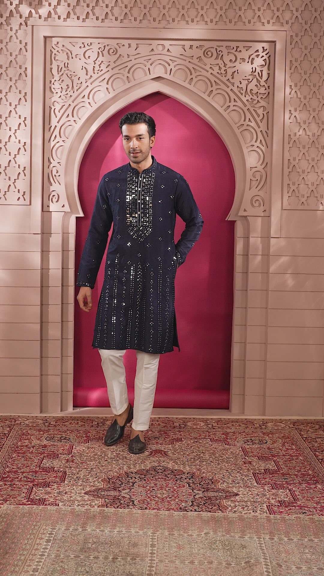 Navy Blue Silk Kurta with Mirror & Thread Work