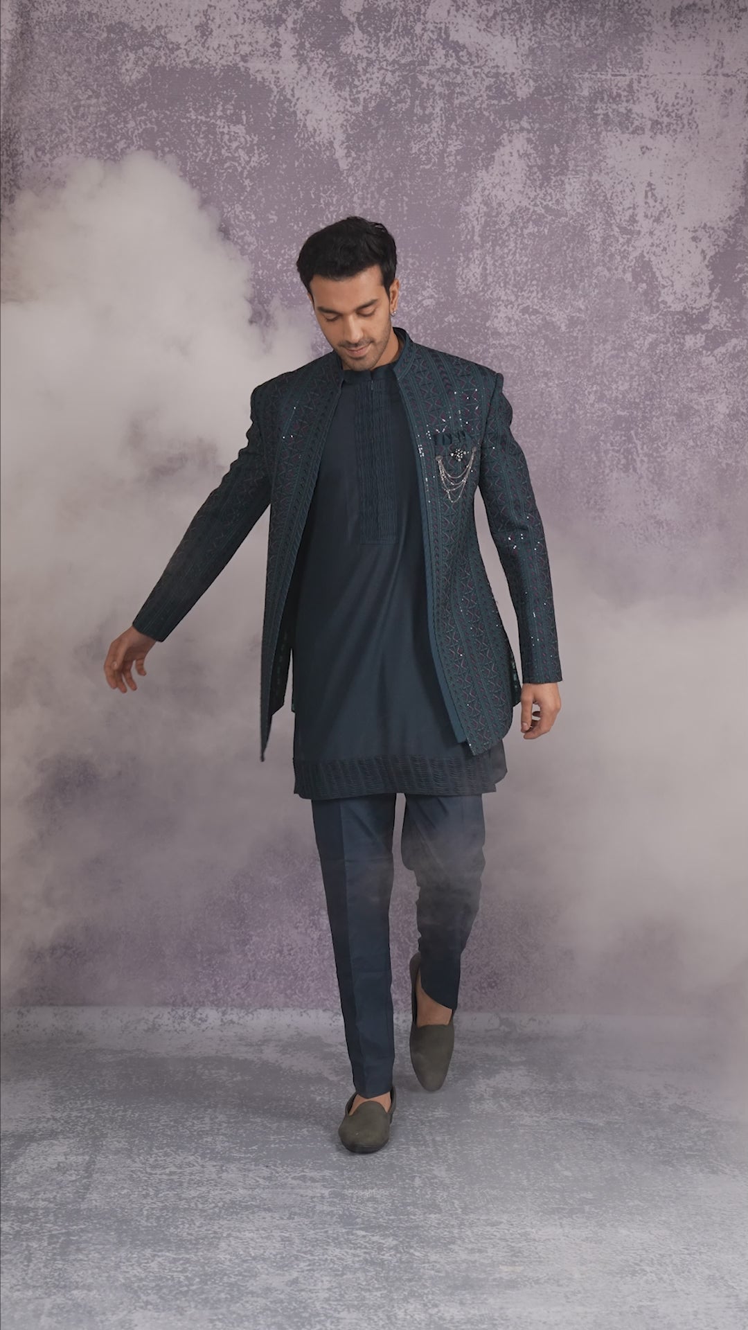 Deep Sea Blue Indowestern Jacket Set with Geometric Embroidery