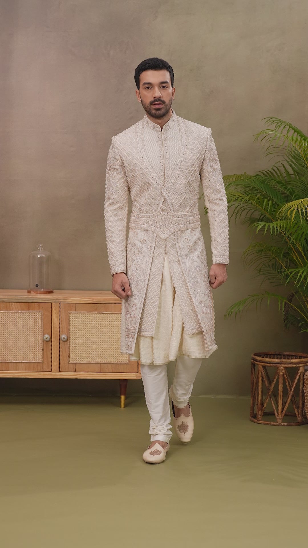 Light Cream Silk Sherwani with Resham Aari Zardoshi Work