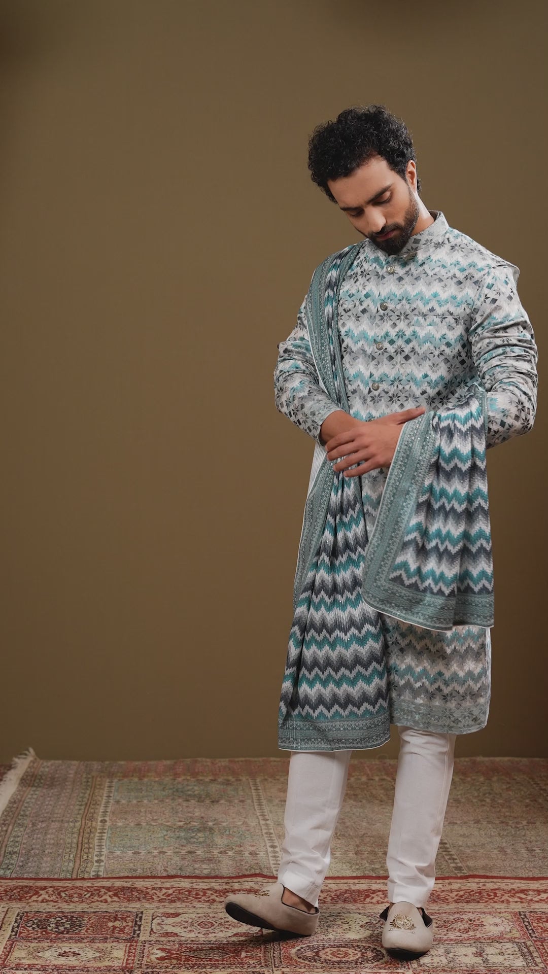 Elevate your ethnic wardrobe collection with our beige silk jacket set. The outfit features geometric patterns with multicolor thread embroidery. The geometric artistry and multicolor embroidery come out beautifully on the beige hue. This jacket for men is a perfect choice due to its contemporary elegance. The accompanying dupatta makes this piece more versatile and allows you to style it uniquely. You can add traditional accessories for a special occasion or wear this beige jacket normally at a formal event. This kurta set is sure to turn heads with its elevated fashion quotient.