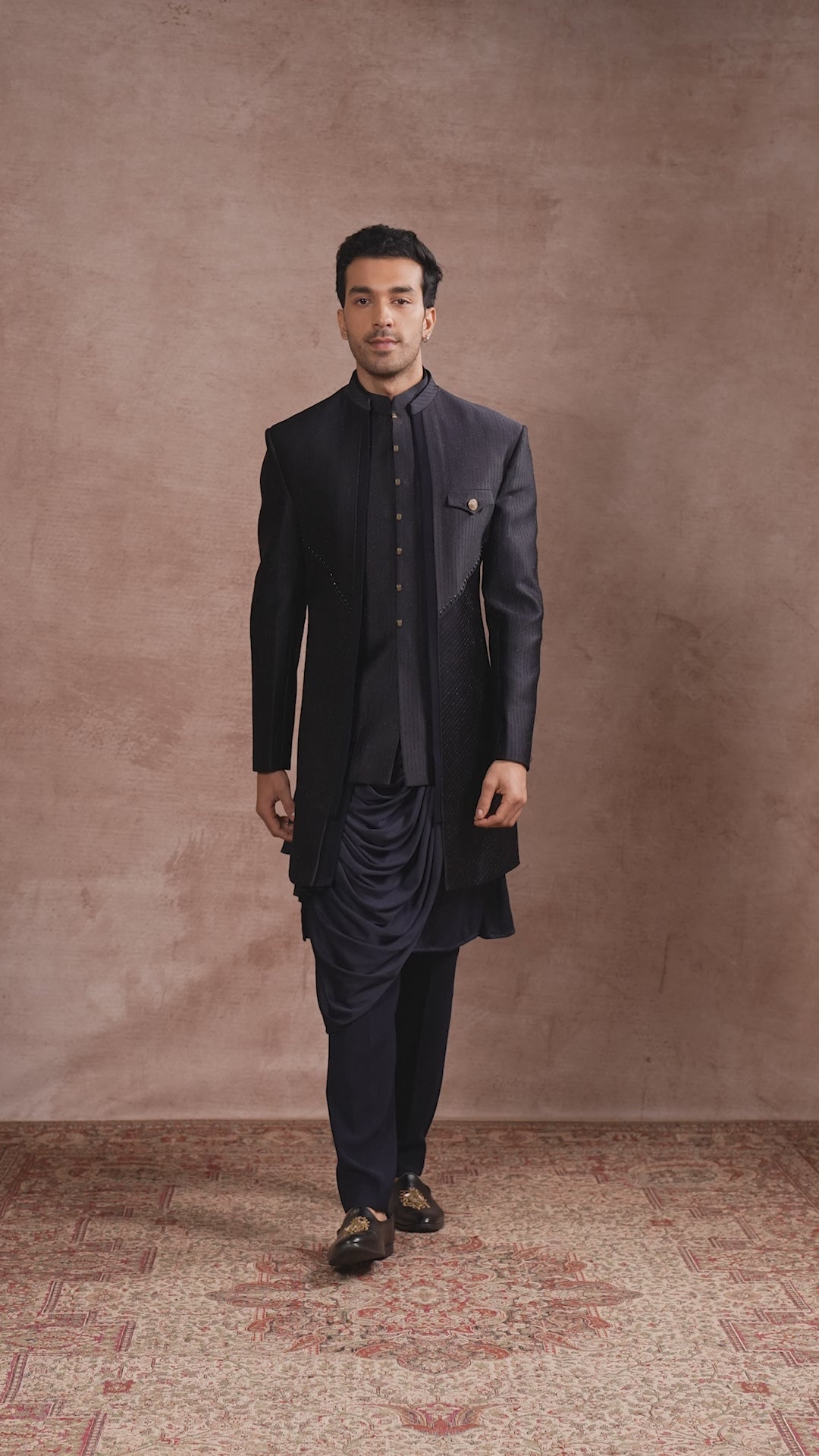 Discover the epitome of ethnic style and class with our black silk Indo western for men. This outfit redefines traditional attire with a contemporary twist. It is perfect for those who seek a balance between the classic charm and the modern elegance. The Indo western jacket, draped kurta, and pants unite to create a striking outfit. It is a versatile piece of clothing that effortlessly uplifts your style and can be used for different occasions. Elevate your wardrobe with our silk ensemble with impeccable embroidery and superior fabric. It will make you a fashion icon, irrespective of the event.