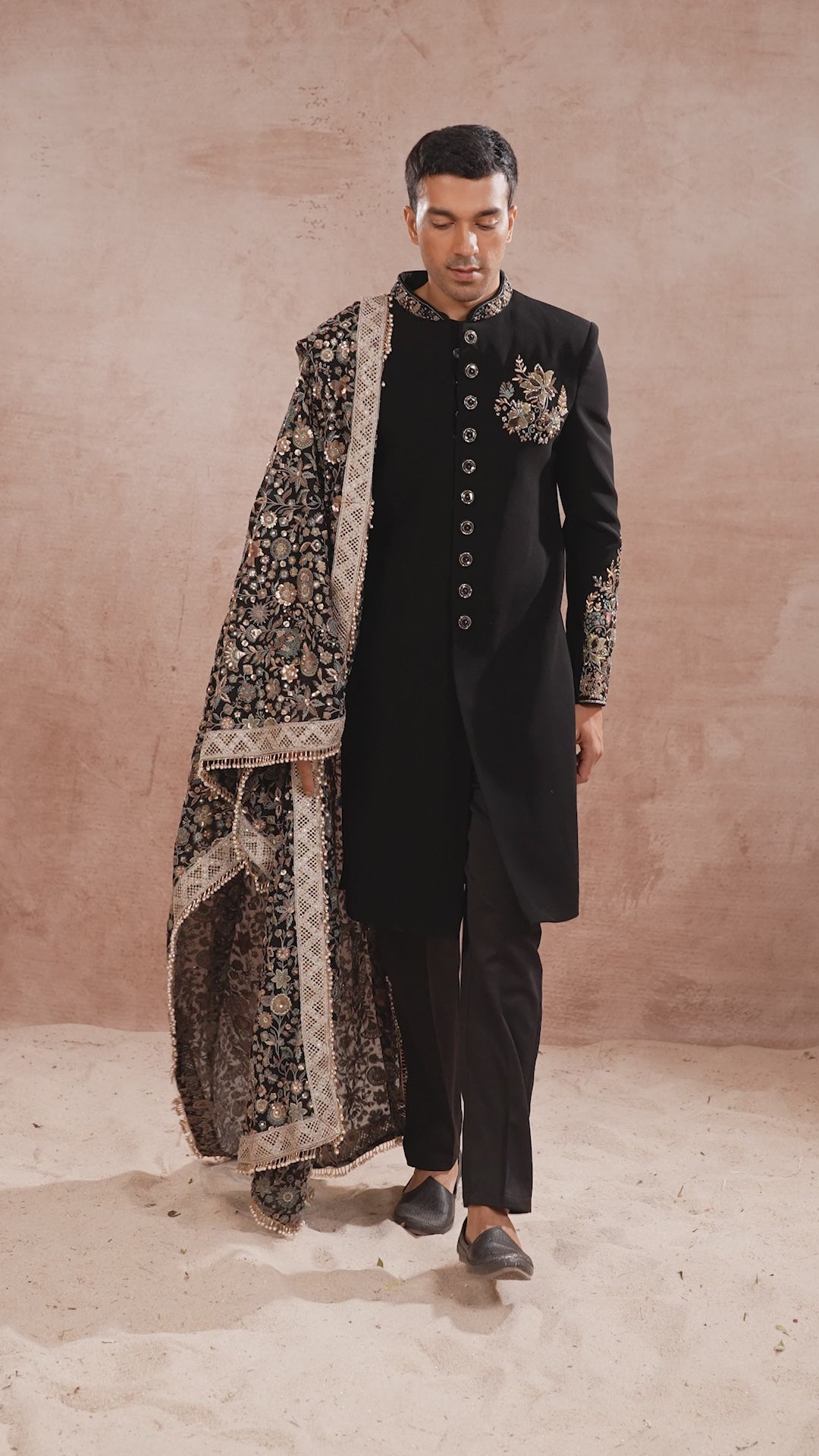 Present yourself at important events with our gorgeous Black Silk Sherwani, designed for the modern groom. Perfect for weddings and festive events, this beautiful work blends modern style with classic creativity. The lush silk fabric feels great; the fine floral thread work, enhanced with beads and sequins, adds glitz. This outfit consists of a gorgeous dupatta that matches a perfectly fitting sherwani and matching pants. Designed for beauty and ease, this sherwani assures you look and feel your best on your big day, therefore impacting everyone around you.