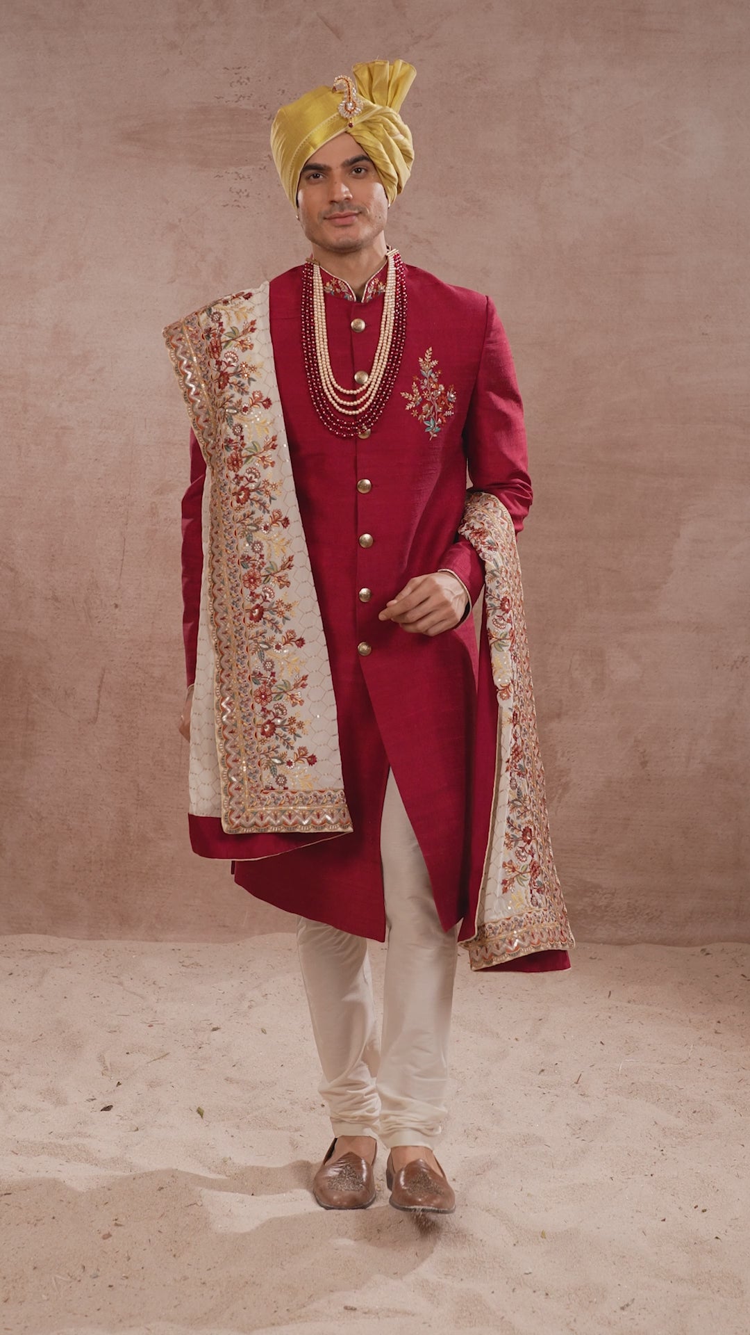 With our bold ruby red Sherwani, designed for the modern groom who appreciates beauty and tradition, you can make a significant entrance. Made from rich raw silk, this beautiful work presents a royal look and a rich texture sure to wow. This Sherwani is ideal for weddings and festive events since the complex thread work increases its elegance and is matched with delicate sequences. Complementing a chic churidar pant and a matching dupatta, this outfit captures the ideal mix of comfort and fashion. This Sherwani for men will make sure you stand out on your unique day, whether you're going down the aisle or celebrating an important event.