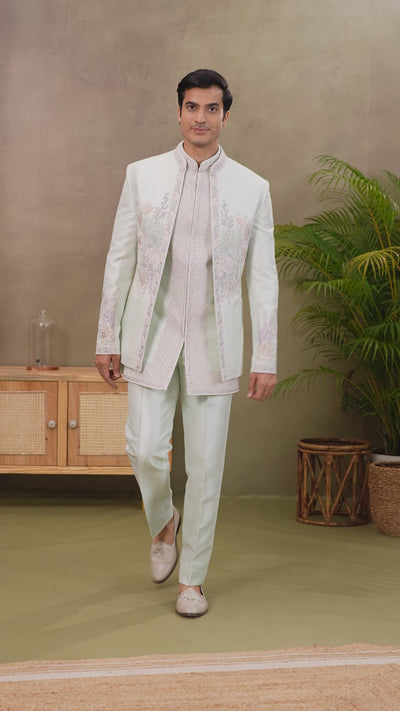 This Ice Blue Jodhpuri Suit is designed for men who prefer a refined look with a strong cultural base. The soft blue tone adds freshness to traditional styling, making it suitable for wedding functions, formal celebrations, and ceremonial gatherings. The structured jacket and coordinates on our Jodhpuri Suit for Men bottoms maintain a sharp appearance that works well for day and evening events.