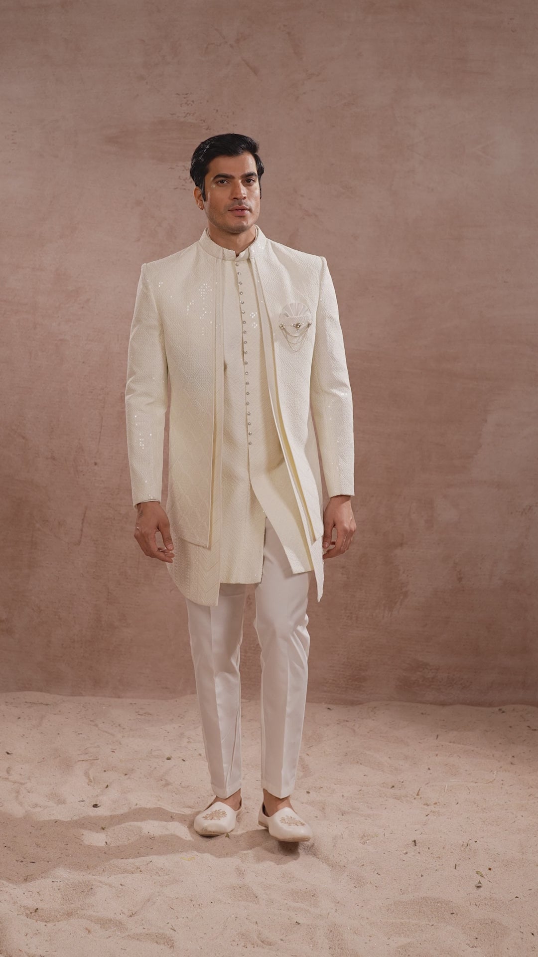 With our beautiful three-piece set meant to accent your wardrobe, our elegant white Indo-Western outfit will help you to step into class. For the modern man who values both history and modernity, this layered jacket looks great with a nicely made kurta and matching pants. Beautifully draping and providing comfort, the flowing georgette fabric assures you look sharp at any event. The complex geometrical chikankari embroidery, carefully designed for elegance, is the focus of this set. This Indo-Western outfit will draw attention whether it's for a formal party, celebration, or wedding.