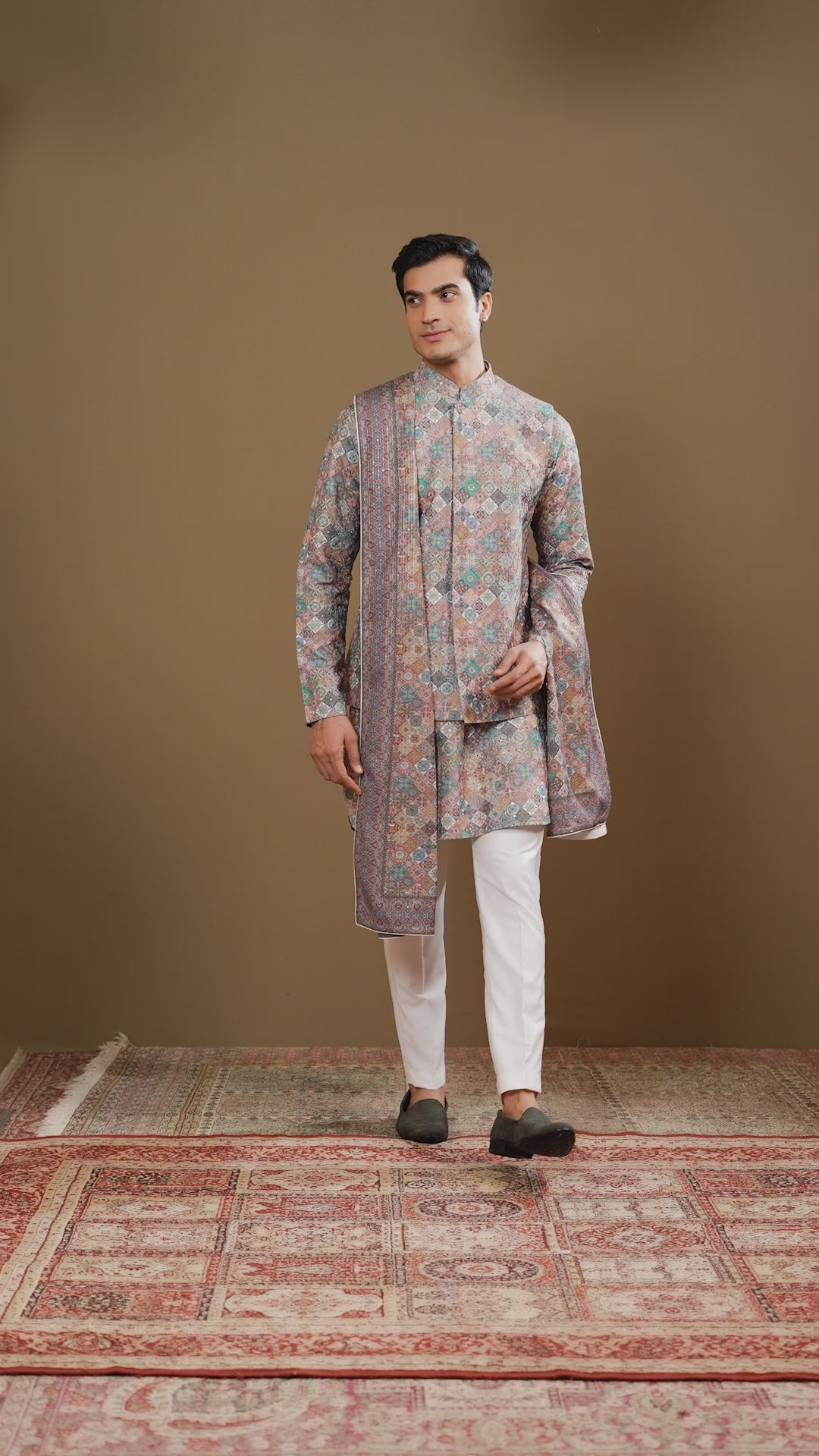 The elegant multicolor silk embroidered jacket set is among our jacket collections' top options. This ensemble offers an exquisite design for elevated fashion standards. You can style this multicolor jacket for men at weddings, festivals, or formal gatherings. The sequins on the jacket add a glamorous touch. The dupatta completes the look and adds further layers to this stunning piece. The geometric print on the kurta, Nehru jacket, and dupatta are truly captivating. Crafted to perfection, this multicolor silk jacket set is the epitome of elegance, style, and comfort.