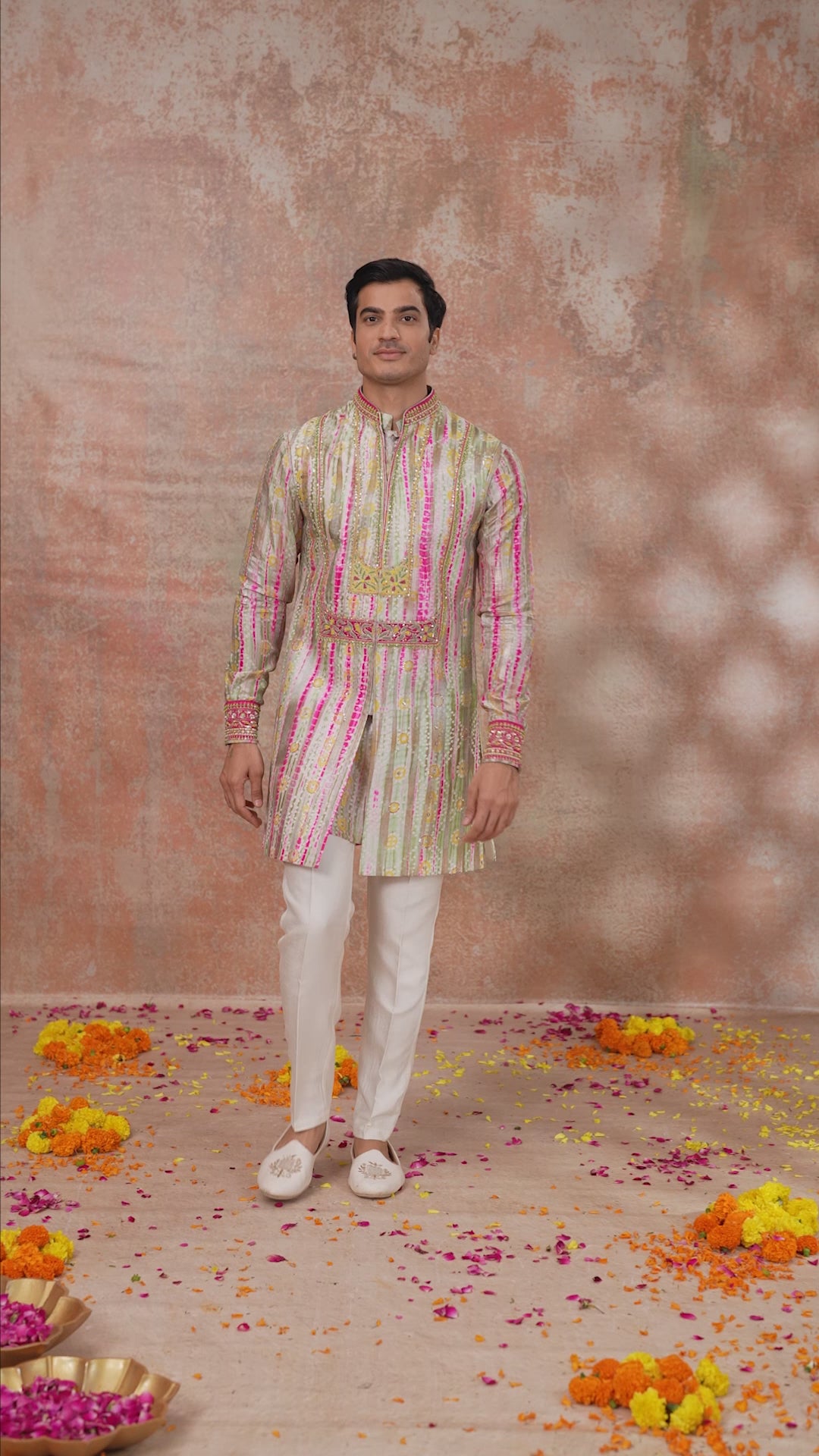 Our Multicolor Silk Koti Kurta Set is designed for family celebrations and wedding-related functions. The mix of colours adds vibrancy, making it suitable for daytime events, traditional gatherings, and cultural celebrations. The layered kurta pajama and koti format brings a structured ethnic look that works well for photographs and public appearances. This wedding kurta for men suits men who prefer colourful ethnic wear without relying on heavy tones.
