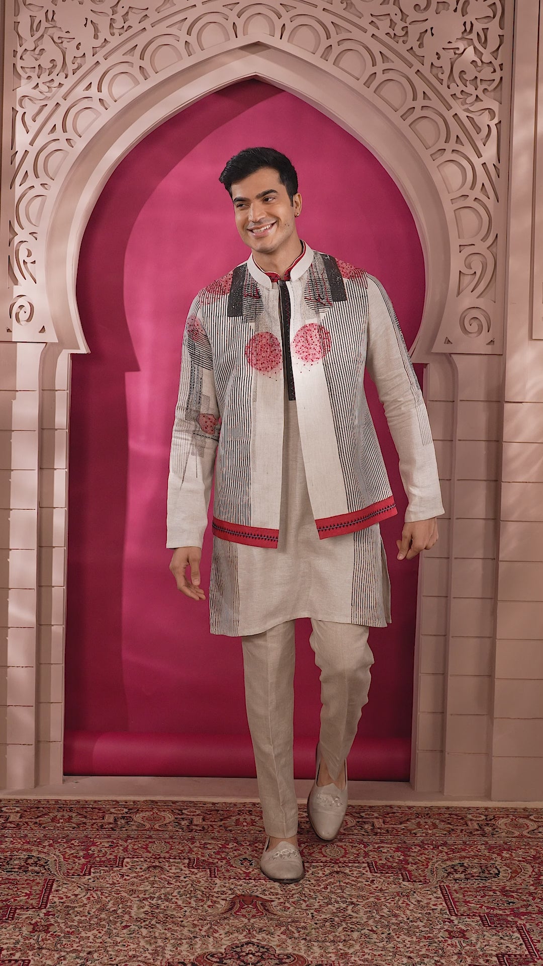 Feel the premium look with our Off White Linen Jacket Set from Shreeman. Crafted for men who value style and comfort, this elegant 3-piece set includes a finely embroidered jacket, kurta, and pants. The intricate hand embroidery combined with a subtle print elevates the design, making it the ideal choice for weddings or special events. Made from premium linen, this Wedding jacket set ensures breathability and comfort, while keeping you looking sharp. Are you a groom or a guest, this set offers a timeless, classy look that will make heads turn.