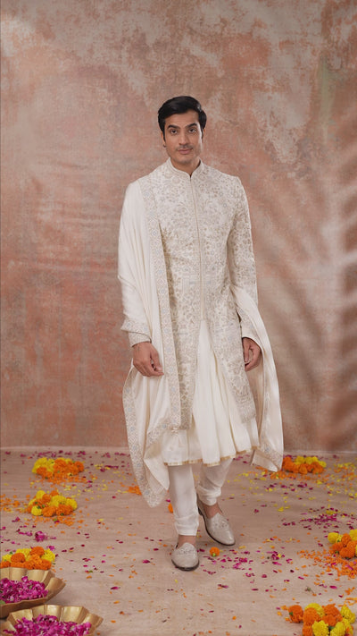 Off White Silk Sherwani with Resham Zardosi Work