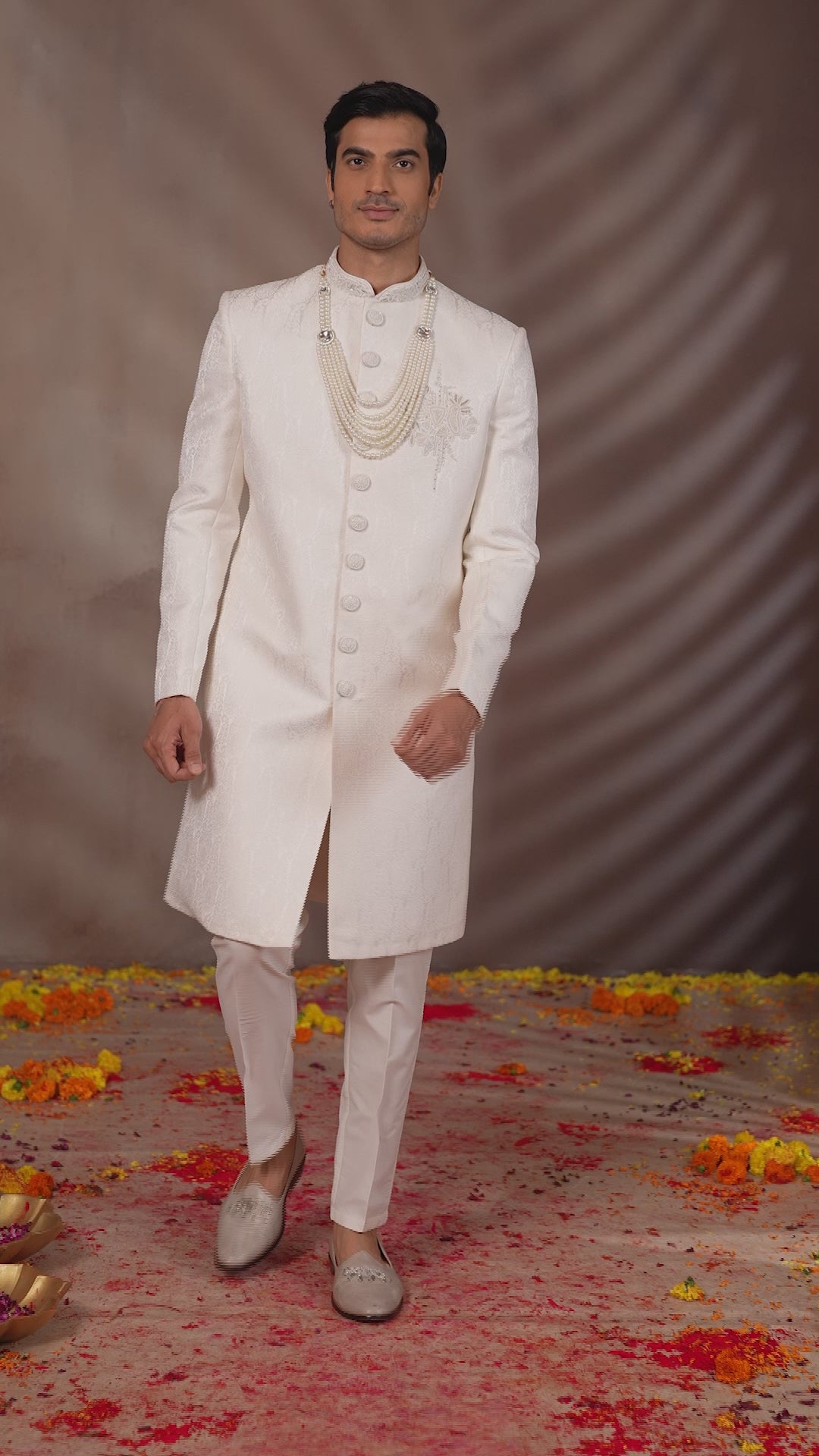 Set a new standard for ethnic fashion by choosing this Off White Sherwani, a piece that showcases the beauty of traditional weaving and high-end tailoring. This garment is a premier choice for the groom who wants to exude a sense of calm and luxury during his main ceremony. The woven texture of the fabric on our Sherwani for Groom provides an added layer of interest, making the off-white tone look multi-dimensional and expensive. This Wedding Sherwani is constructed to highlight a sharp, masculine frame, ensuring you feel at the peak of your style while greeting guests and participating in high-energy family functions.