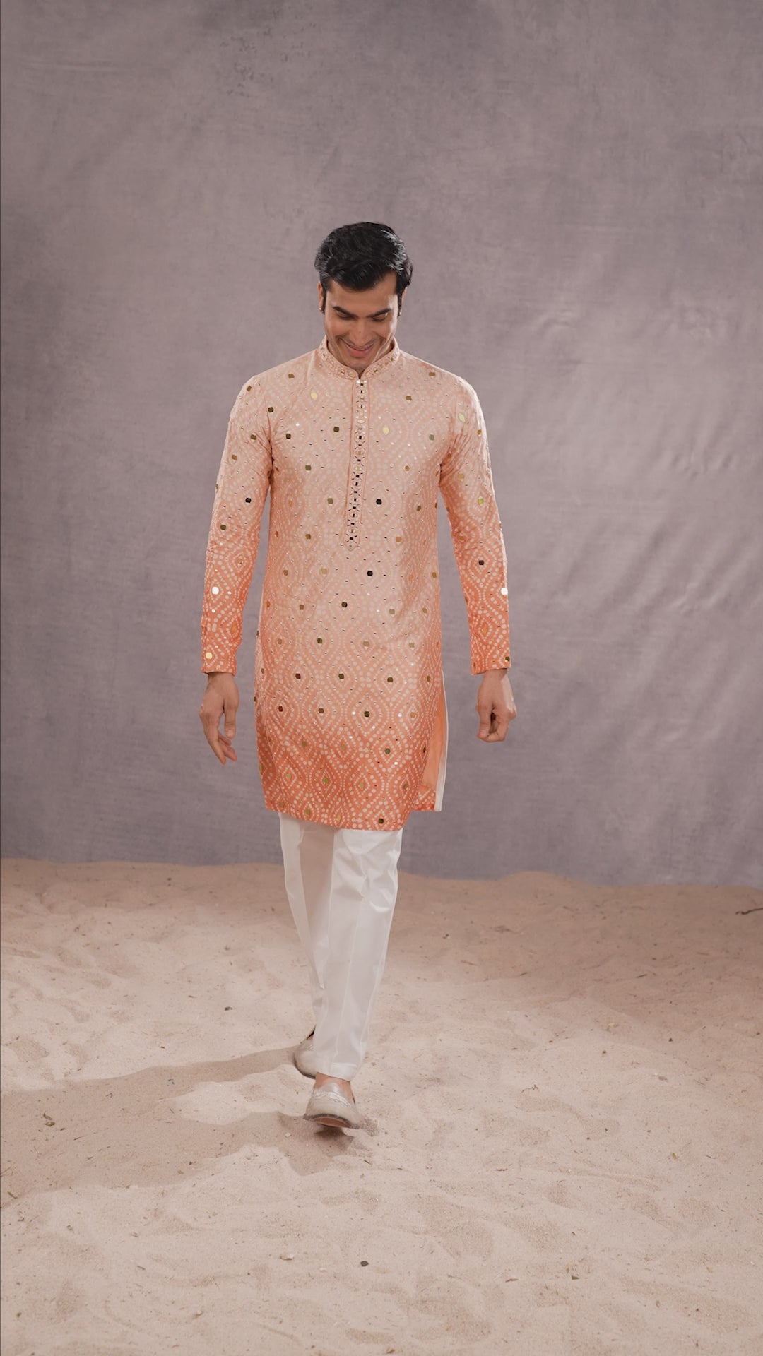 Prepare to turn heads with our Ombre Dye Silk Kurta! Designed from silky, premium silk that drapes elegantly, this magnificent work blends luxury and style. The ombre dye adds a modern flair to a traditional design by producing a beautiful gradient look. This kurta set, accompanied by intricate mirror work, sensually captures the light. This attire will keep you feeling comfortable and looking excellent whether you are celebrating a festival or a wedding.