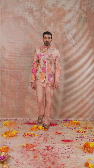 Break away from conventional dark palettes with this refreshing onion pink masterpiece that redefines modern ethnic charm. This Jodhpuri Suit for Men is designed for the gentleman who appreciates a soft, sophisticated color story paired with a rigid, authoritative cut. The high-neck collar and structured shoulders provide a crisp, clean look that works wonders for daytime engagements or high-profile engagement parties. We focus on a tailored fit that highlights a sharp profile, making it a standout choice for those who want to look approachable yet distinguished.