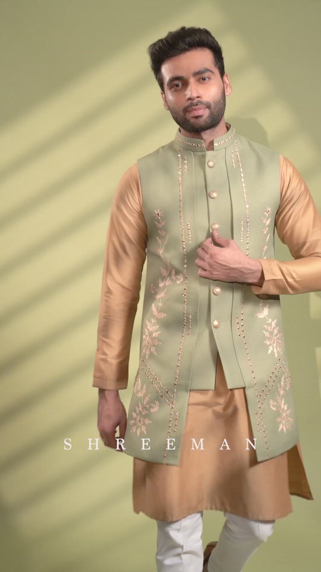 Bring the royal look of modern to your wardrobe with this designer pista Jacket Set with peach plain Kurta and pant. It includes a jacket, Kurta and pants. Made from pure silk, this set features mirror work and resham embroidery that makes it an ideal choice for special occassions.