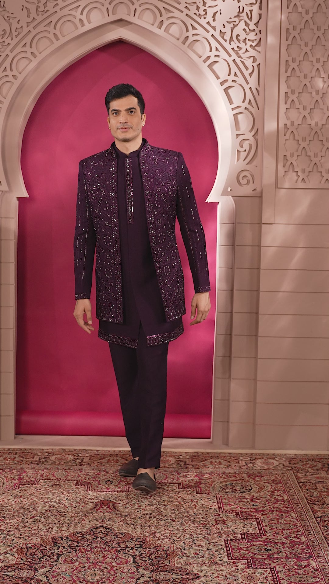 Try our Wine Silk Wedding Indo Western Set from Shreeman. Designed for the modern groom or wedding guest, this 3-piece ensemble includes an open jacket, front-open conceal button kurta, and pant. The intricate Aari, Resham, Sequence, Bead, and Cut Dana work adds a luxurious touch, making it perfect for grand celebrations. Crafted from premium silk, this outfit combines comfort with elegance, ensuring you look regal and feel confident. Whether it’s your wedding or a festive event, this Indo Western for men set will make you the center of attention.