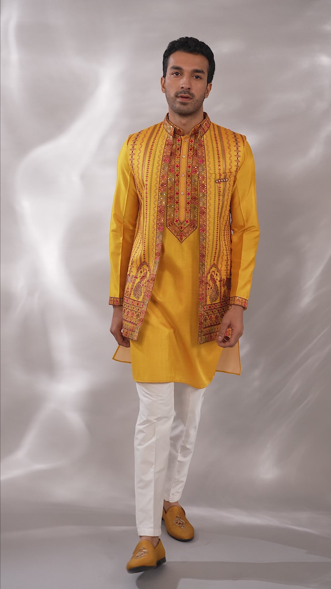 Imagine stepping into a celebration, and you are the sunshine in the room – that is what this yellow Jacket Set does. It is not just an outfit; it is a burst of joy! This Indo Western set is perfect for those who want to stand out with a touch of traditional elegance. The open jacket design gives it a modern, stylish edge, while the vibrant yellow silk makes it perfect for festive occasions. It is a perfect jacket set for men. This wedding jacket set is designed to make you feel confident and radiant. Trust me, you'll be the highlight of any event.